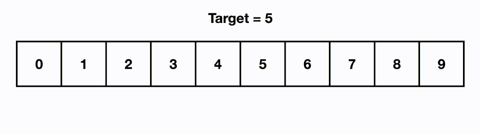 가령 예를 들어 아래와 같이 찾고자 하는 값이 5일 경우, 배열의 가운데인 4를 기준으로 삼은 다음 오른쪽에 있다는 것을 알 수 있다. 이후 왼쪽 배열 0~4를 배제하고 오른쪽 배열 5~9 부분을 탐색한다. 찾고자 하는 값이 5~9 부분의 중앙인 7을 기준으로 왼쪽에 있으므로 다시 오른쪽 배열을 배제하고 왼쪽 배열 5~7을 탐색한다. 6을 기준으로 왼쪽에 있으므로 오른쪽 7을 배제하고 왼쪽 5를 찾으며 탐색이 완료되는 방식으로 동작한다.