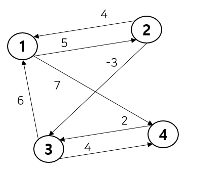 최종 출력되는 최소 비용 중 1에서 1로 가는 사이클은 없으므로 0이 된다. 또한 만약 주어진 문제가 1에서 3으로 가는 최소비용을 구하는 것이라면 5가 되고, 1에서 4로가는 최소 비용을 구하는 것이라면 6이 된다.