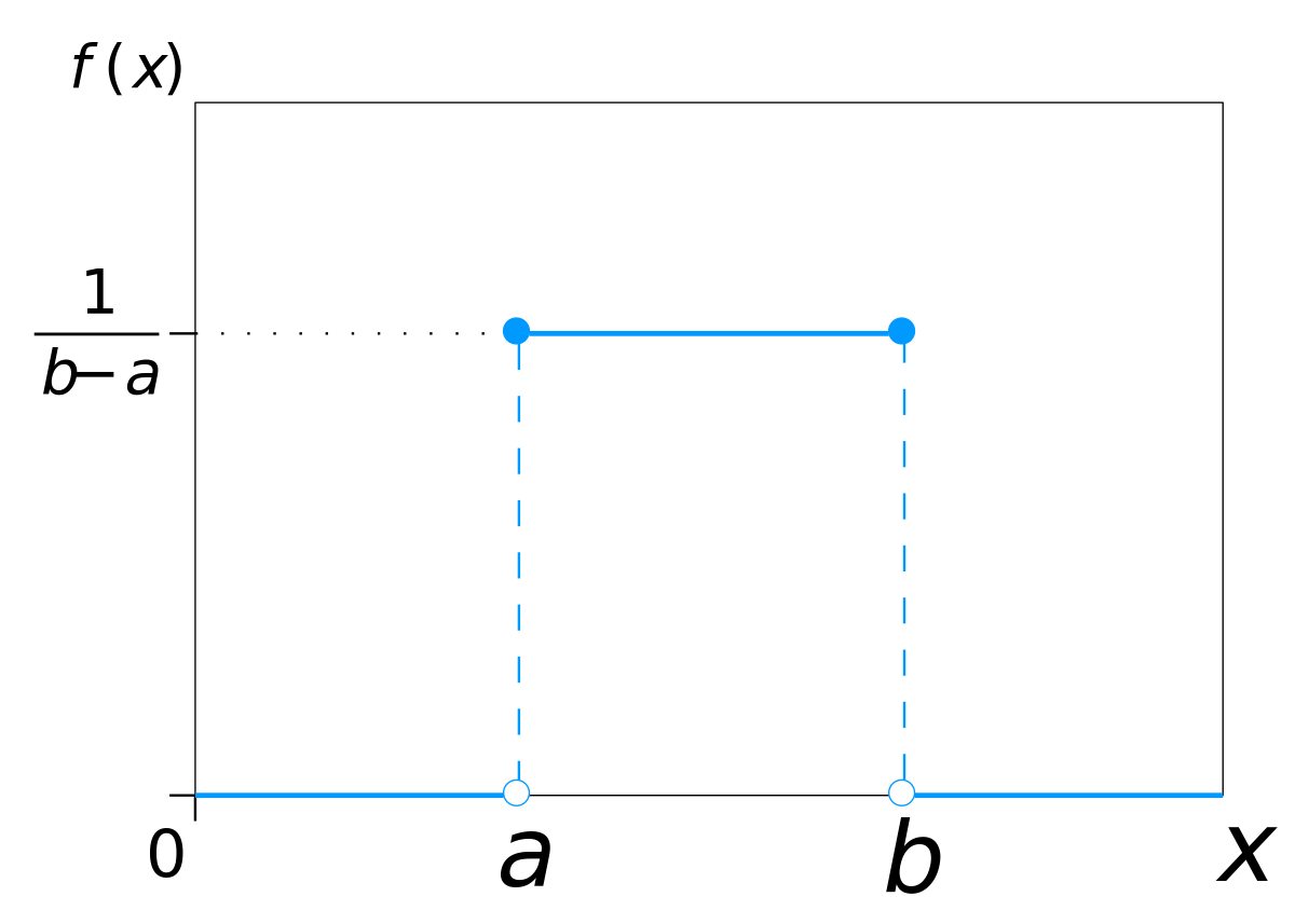 $\displaystyle f(x)= \begin{cases} {1 \over b-a}, & a\lt x \lt b \\ 0 & {x\lt a, b\lt x} \end{cases}$