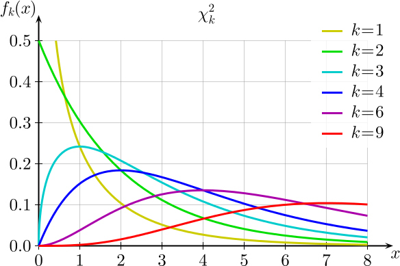 카이제곱분포의 형태에서 앞 부분에 확률 변수 값이 큰 이유는 뒤로갈수록 정규분포의 양끝과 같은 편향이 상대적으로 적어지기 때문이다. 이 카이제곱 분포를 조금 더 덧붙여 설명하면, $k$개의 서로 독립적인 표준정규분포의 확률변수를 각각 제곱한 후 더하여 얻는 분포다. 이 때 $k$는 표준정규분포를 따르는 확률변수의 개수로 카이제곱 분포의 형태를 결정하는 자유도로서 역할을 한다. 이 $k$에 따라 카이제곱 분포의 형태가 아래와 같이 달라진다. 자유도의 크기가 증가할수록 점점 대칭성을 갖게 되며 통상 $k=30$이상이면 거의 정규분포에 가까워진다고 한다.