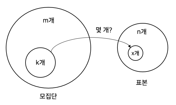 초기하 분포는 아래 그림처럼 크기가 $m$인 모집단에서 크기 $n$인 표본을 추출했을 때 모집단 내 원하는 원소 $k$개 중 표본 내에 $x$개 들어있을 확률 분포를 의미한다.