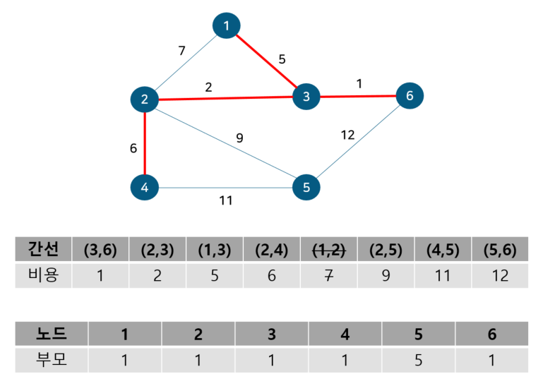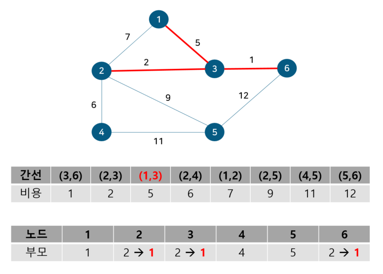 노드 1, 3의 부모 노드를 살펴보면 각각 1, 2로 다르기에 사이클이 발생하지 않는다. 따라서 최소 신장 트리에 (1, 3)을 포함시키고 부모 테이블에서 노드 3의 부모를 노드 1로 업데이트 해준다. 이 때 노드 2, 6도 부모 노드를 2로 가지는 종속 관계에 있으므로 함께 바꿔준다. 다음으로 노드 2, 4를 살펴보자