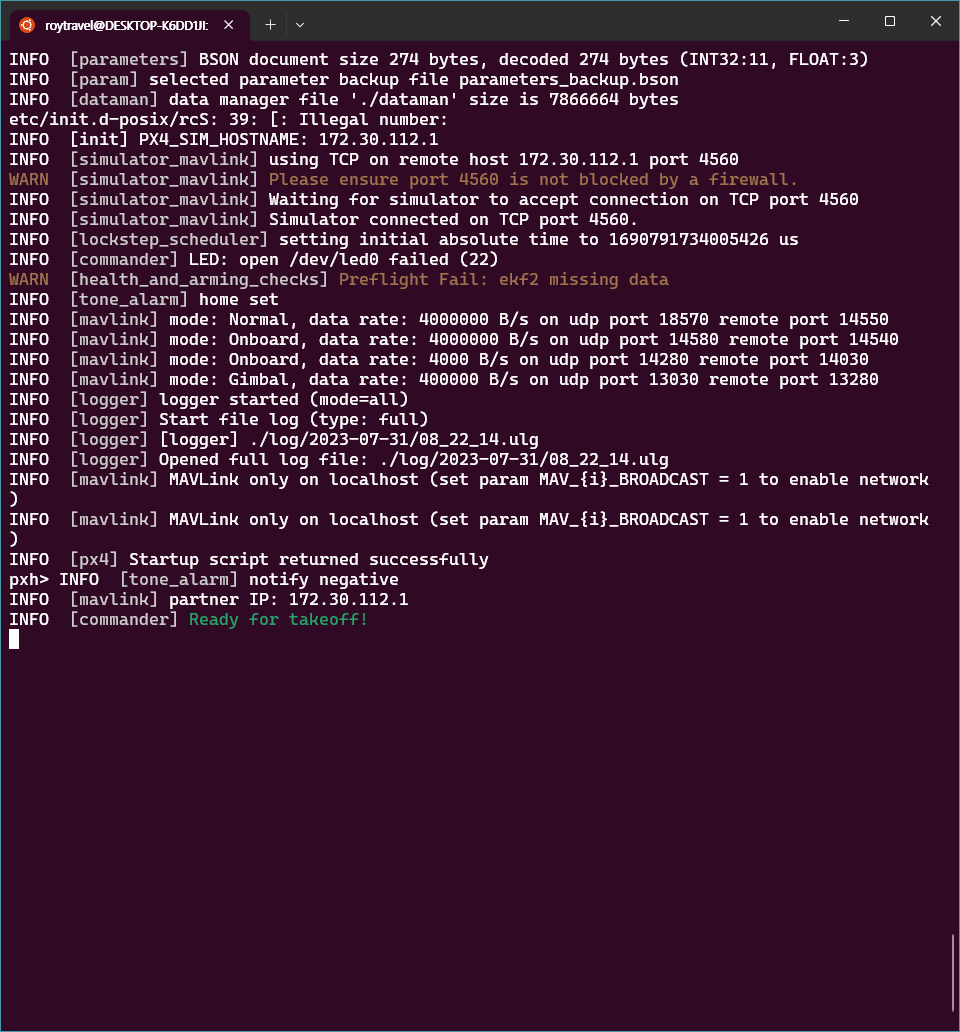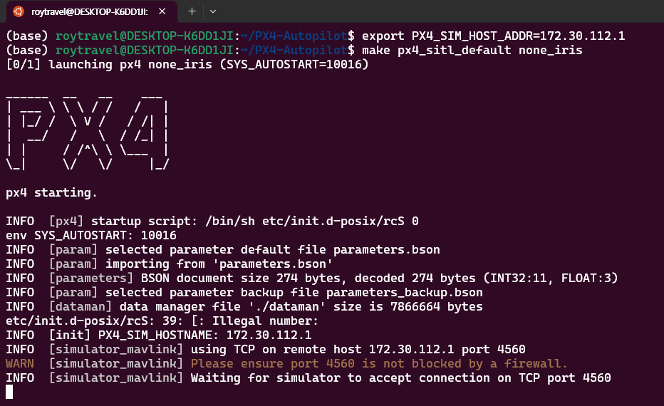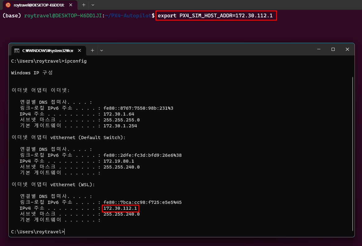 만약 make 과정에서 오류가 발생한다면 g++, cmake 등의 빌드를 위해 필요한 패키지를 설치해주어야 한다. 그리고 Windwos 11에서 구동되는 AirSim이 PX4와 연결되기 위해서 PX4의 IP address를 알아야 한다. ipconfig를 통해 WSL에 할당된 IP를 환경변수 PX4_SIM_HOST_ADDR에 할당해준다.