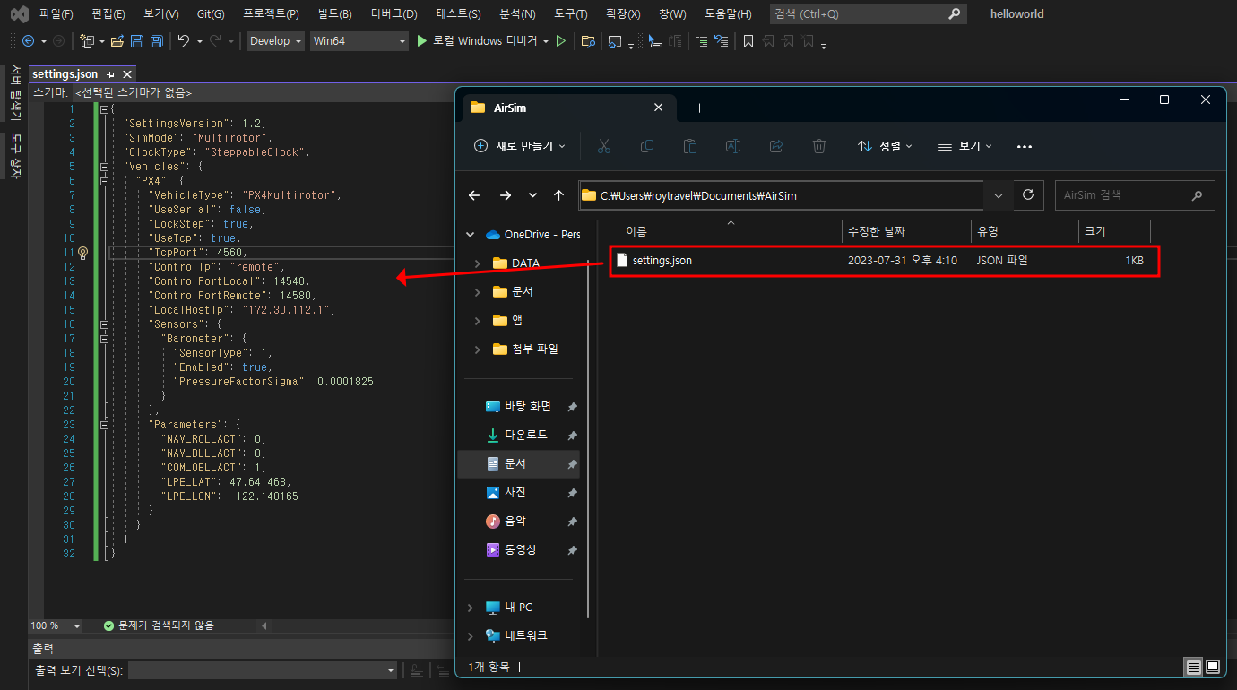 참고로 위 settings.json은 다음 링크를 참조하였다. https://microsoft.github.io/AirSim/px4_sitl_wsl2/