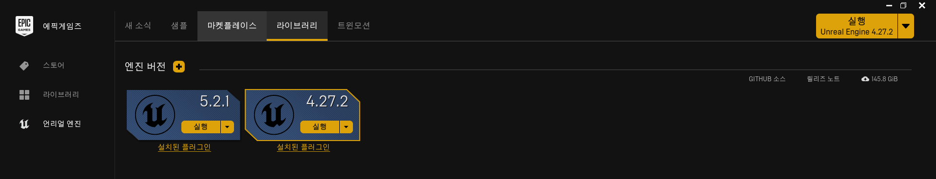참고로 UnrealEngine 설치를 수행할 때 UnrealEngine 4.27 이상을 다운로드 받으라고 되어 있는데 23.07.31 기준 5.2.1 버전을 다운로드 받게 되면 UnrealEngine을 구동할 때 "Physxvehicles" 플러그인이 없다는 오류가 발생하므로 4.27 버전으로 맞춰 다운로드 해야 에러가 발생하지 않는다. UnrealEngine은 아래와 같이 독립적인 버전을 각각 설치해 관리할 수 있다. 4.27.2 버전을 다운로드 받자.