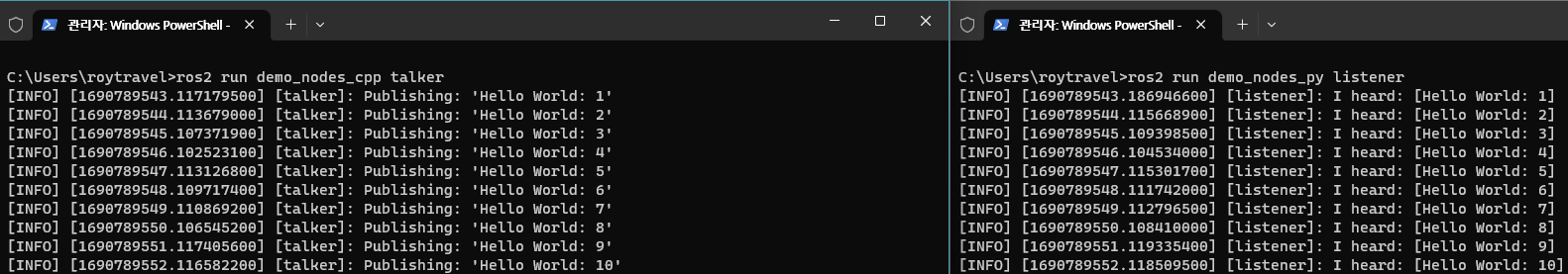 설치해야할 것들이 많았다. chocolatey, python, visual studio, opencv, qt5, rqt 등을 위 공식문서에 따라 설치를 수행했다. 최종적으로 'hello world'를 수행했을 때 아래와 같이 topic을 publish하고 subscribe 할 수 있다면 설치가 완료된 것이다.
