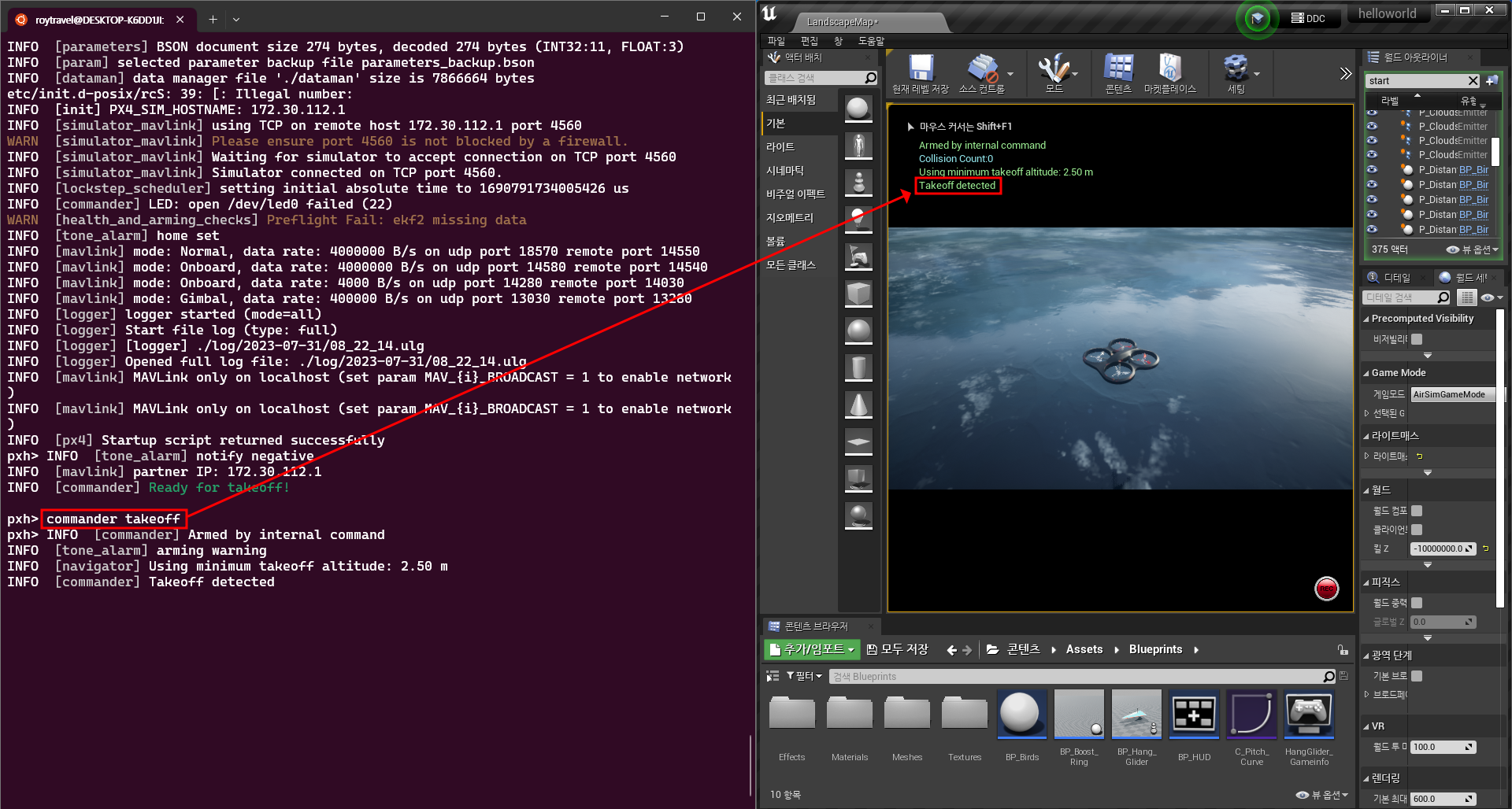 현재 상태에서 아래와 같이 commander takeoff 명령을 수행하게 되면 AirSim 시뮬레이션 상으로 명령이 전달되어 드론이 이륙하는 것을 확인할 수 있다.